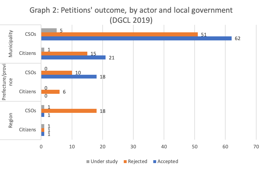As showed by graph 2, another important insight from the report is that the right to petition has mostly been exercised in municipalities. Between 2015 and September 2019, 73% of petitions has been presented to municipalities, against 16% to prefecture or provinces and 11% to regions. Being the closest level of government to citizens and bearing key competences in terms of local service delivery, it is perhaps expected that citizens and associations mostly focused on the municipal council to present their grievances in the form of petitions.