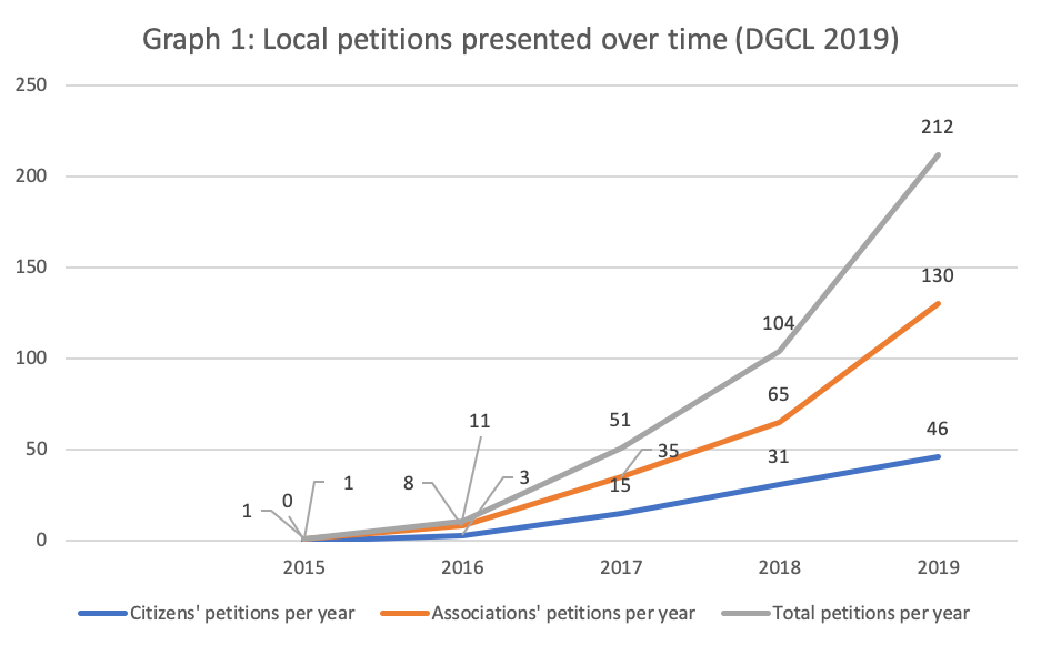 After a shy beginning, graph 1 shows that the right to petition has been exercised increasingly over the years – and especially by associations. The difference between the exercise of the right to petition by citizens and associations is explained by the conditions to exercise this right: at the local level, associations do not have to provide a list of signatories to support the petition.[3] This makes the task substantially easier, as it avoids having to convince fellow citizens to sign the initiative. This has proven to be a central obstacle in gathering the necessary signatures, as citizens often remain wary of retaliation for actions that can be perceived as political.[4]