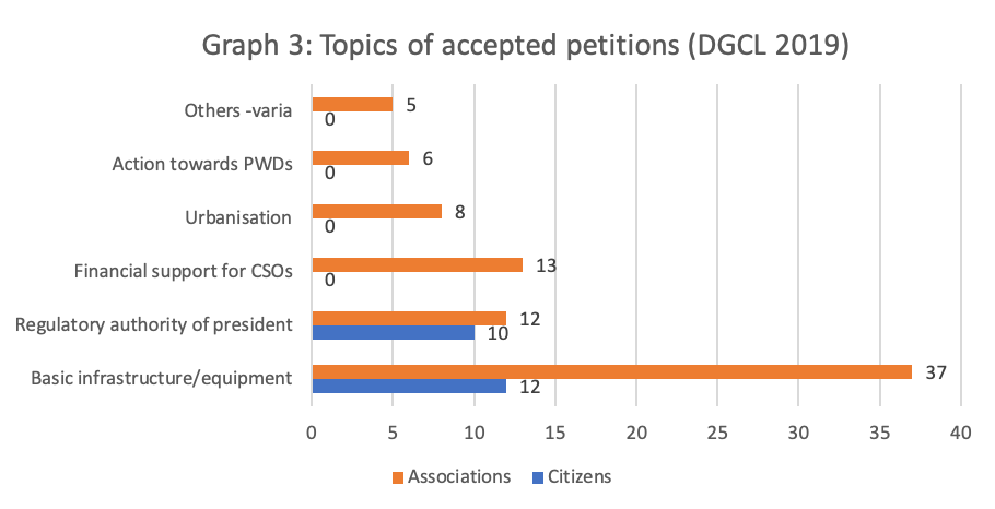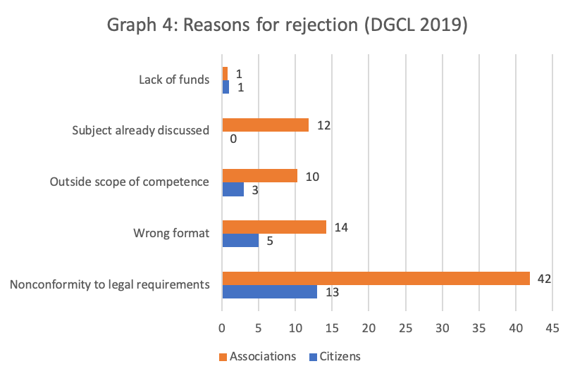 The final graph extrapolated from the 2019 report of the Directorate General of Local Governments concerns the reasons of rejections. It is immediately clear that the main issues that caused the rejection of petitions up to September 2019 are related to the form of citizens’ requests – rather than the substance. For associations, the nonconformity to legal requirements mostly relates to not being of at least 3 years old, not having an official récépissé, or to having presented a petition on a subject on which the association doesn’t work on. For citizens, the nonconformity is rather related to the signatures supporting the petitions (not reaching the threshold for signatures, not providing all the valid supporting documents, not validating all the signatures, etc.).